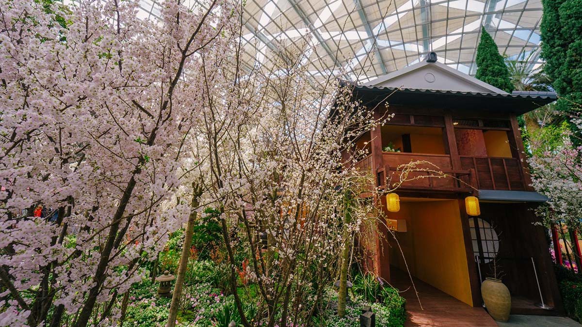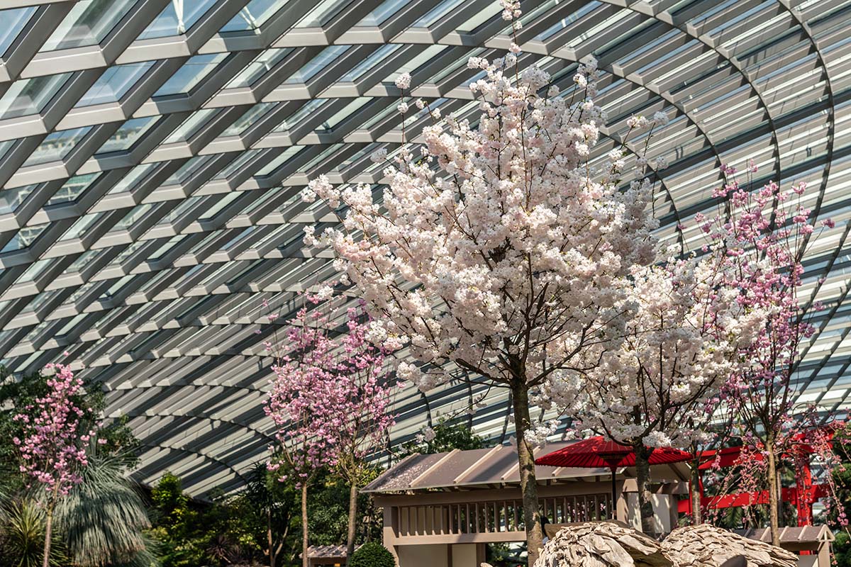 Japanese pink and white cherry blossoms bloom beneath the glass ceiling of Gardens by the Bay’s Flower Dome, with a red Torii adding a traditional touch.