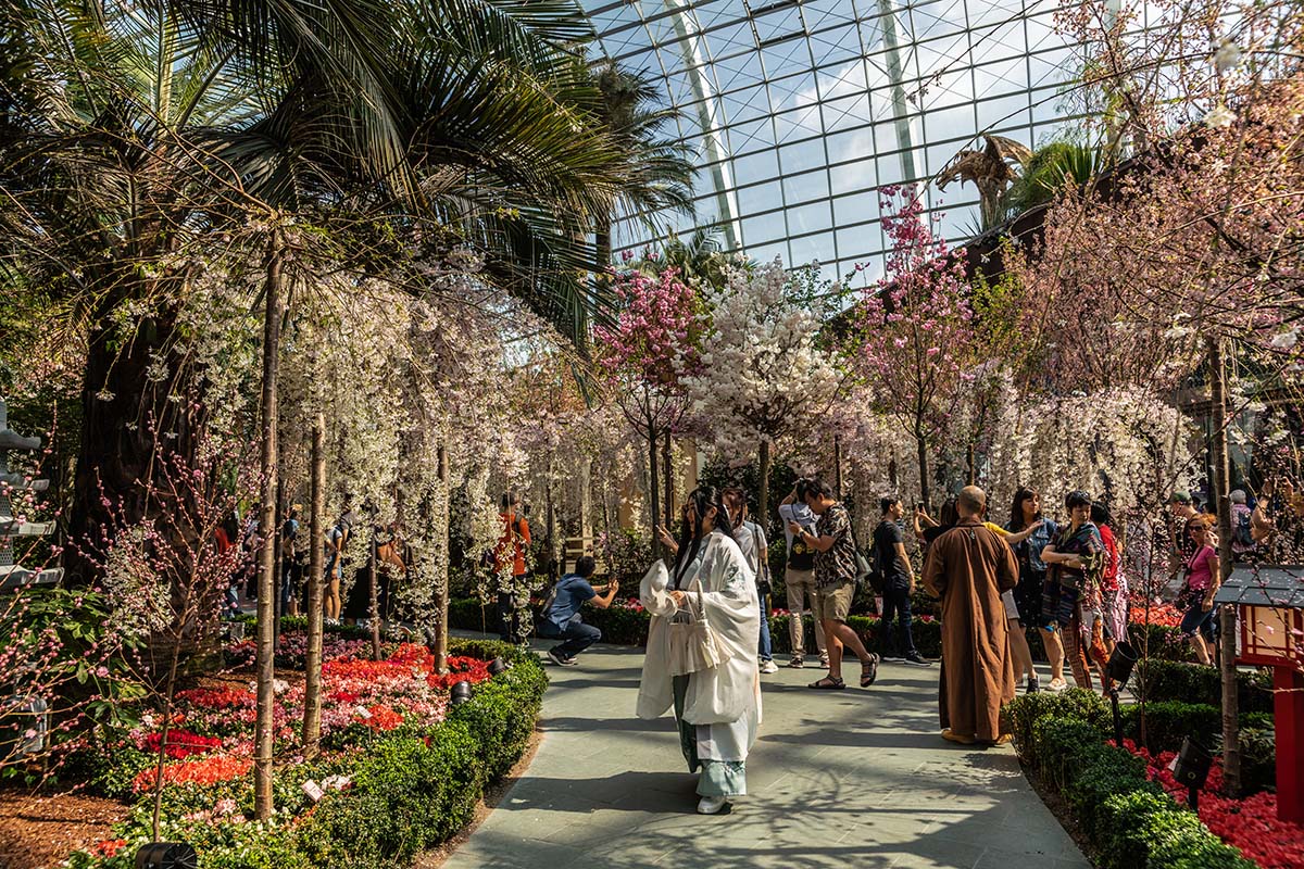 Visitors stroll beneath a profusion of Japanese cherry blossoms inside Singapore’s Flower Dome, the world’s largest glass greenhouse, where Japanese tradition meets Singaporean innovation in a celebration of nature, culture, and community.