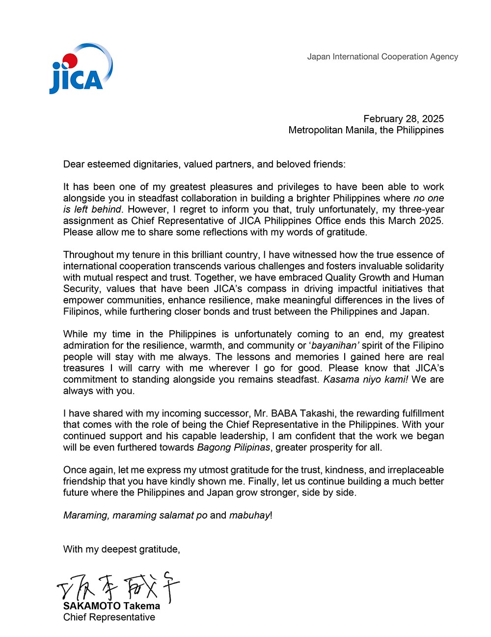 JICA remains committed to the Philippines, as a friend closer than a brother, and I am confident my successor will further strengthen this partnership.