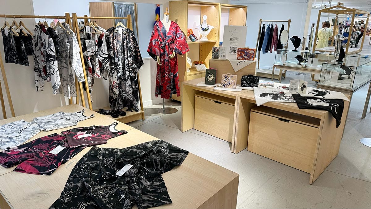 “I love the look of kimonos, and I wanted to make them in a way that’s more relevant to my own experiences and influences. I enjoy how they look Japanese, at first glance; but they’re not the typical kimono, when you look closer. I was very flattered when a Japanese customer told me that she loved my kimonos precisely because they were unusual. I used to think that Japanese people might not be interested in something designed by a foreigner; something that they already do so well, themselves. So I was pleasantly surprised by the woman’s reaction. She took two of my kimonos home. That made me so happy,” Feanne reflects.