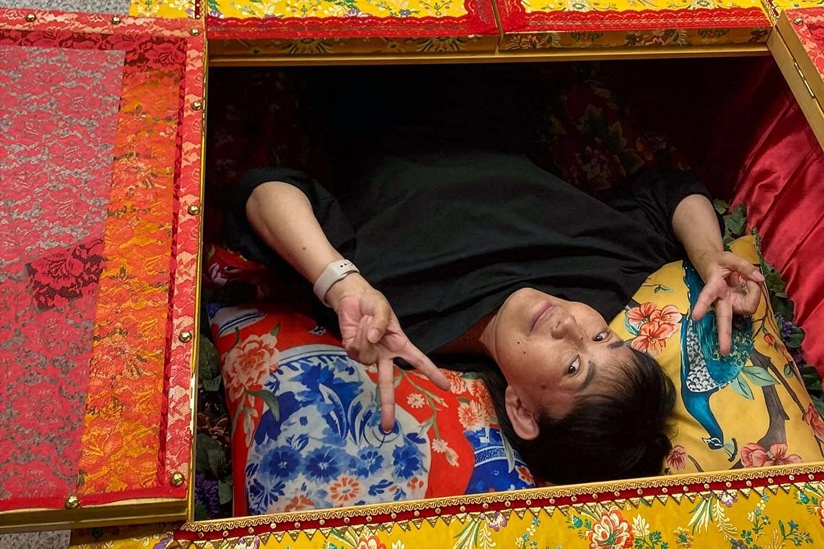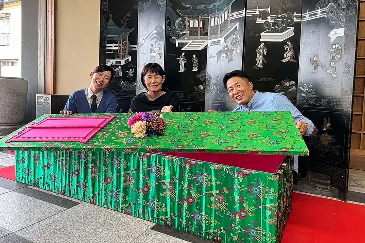 Visitors experience the unique ‘coffin-lying’ service at Kajiya Honten, a 120-year-old funeral home in Futtsu. Guests lie in one of three beautifully floral-printed coffins, in vibrant colors like gold, green, and yellow, for a reflective meditation on life and mortality.