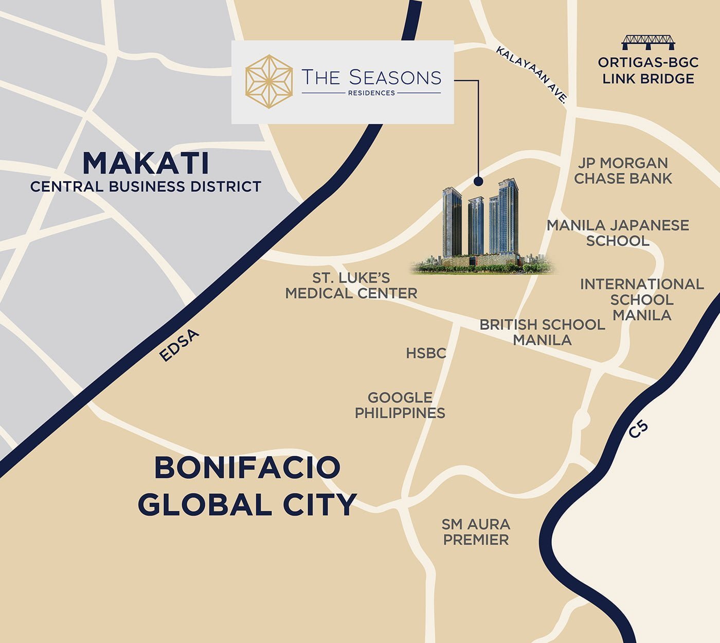 The Seasons Residences rises within thriving Bonifacio Global City, one of the leading financial and lifestyle districts in the Philippines. Attracting multinational firms such as JP Morgan Chase, HSBC, Google and Facebook, BGC prides itself on being at the core of a dynamic and well-connected urban city.