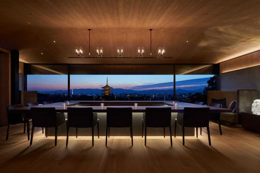 The hotel’s lively all-day restaurant, Kyoto Bistro, opens up to the bustling Ninezaka Street, which allows guests to immerse themselves in the vibrancy of the locale. For an exquisite culinary experience, the French-inspired teppanyaki restaurant, Yasaka, provides a stunning skyline view of the Yasaka Pagoda rising above the tiled roofs of the city.