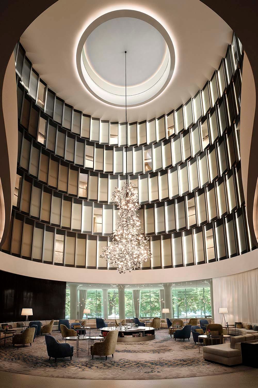 Designed by renowned Hamburg-based architect Jan Störmer, The Fontenay embodies the city’s affinity for water. Envisioned as a “Hotel in the Park,” its organic design, derived from three intertwining circles, creates a structure without a backside, making the hotel feel like a natural extension of the park. This fluid design floods every corner with natural light, while at the center, you’ll find elevators and a glass-enclosed courtyard featuring trees, alongside a stunning 27-meter-high atrium. The circular theme continues throughout the building, with concave and convex facades, ensuring that every room enjoys an outward view.