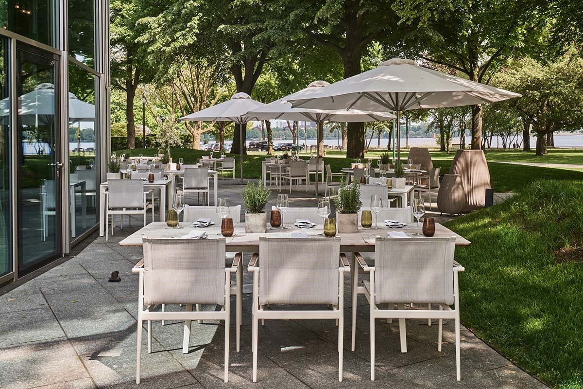 The area surrounding The Fontenay showcases Hamburg’s lush greenery and architectural charm. In the Rotherbaum district, English Tudor-style residences blend with elegant Wilhelminian buildings. The inviting banks of the Alster offer a range of water activities, from stand-up paddling to sailing. With direct access to the cycle path along the Alster and a short distance to the city center, guests can enjoy both Hamburg’s natural beauty and the urban hustle and bustle. The Fontenay’s grounds feature extensive lawns and over fifty large trees, including oriental plane trees that are up to 250 years old. This serene address at 10 Fontenay is within walking distance of Hamburg’s fashionable neighborhoods and the vibrant HafenCity.