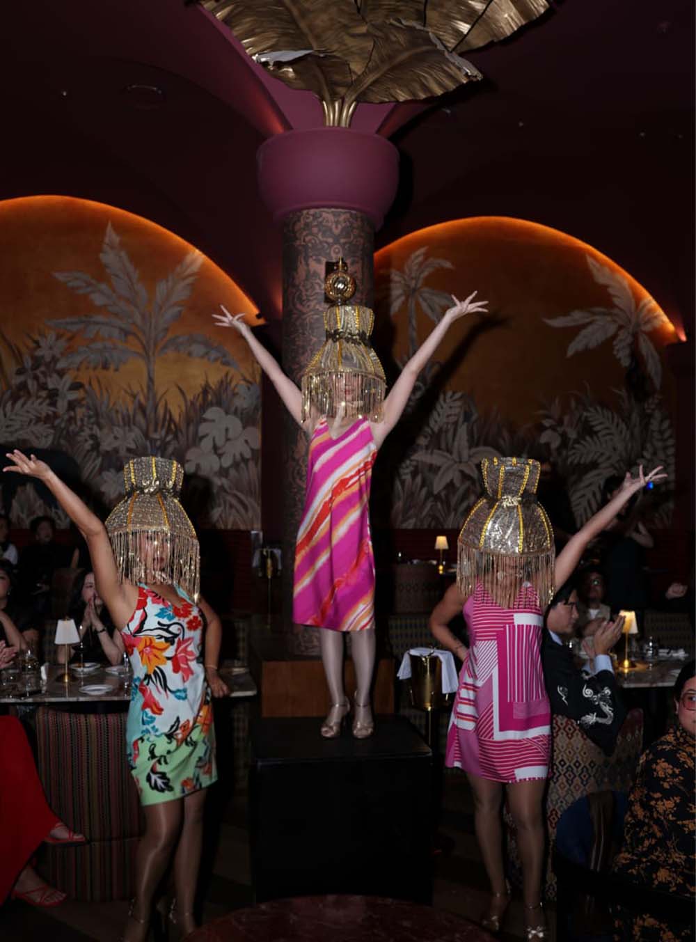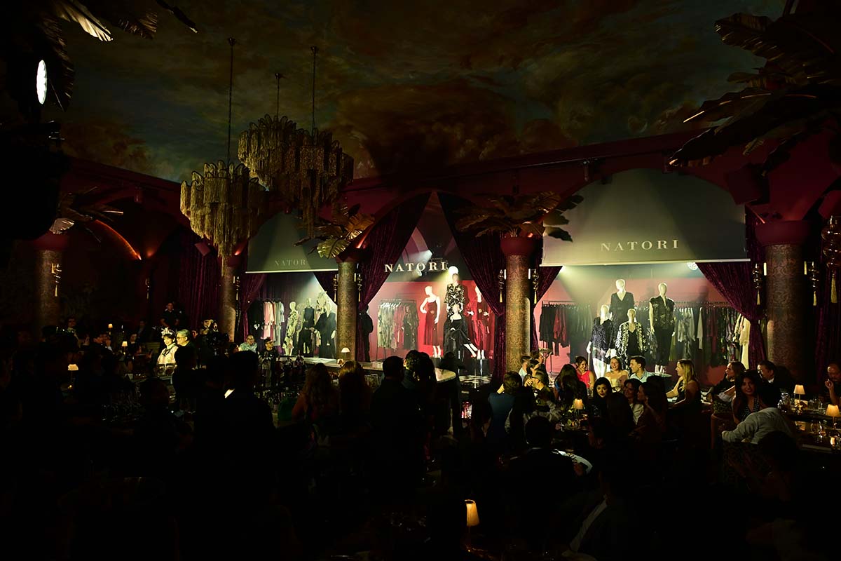 Gone are the days of sterile runway shows with static models. Natori brought the heat to Medusa Supperclub, a venue as lavish as it is edgy, and the result was something spectacular. The vibe was sexy, sophisticated, sassy, with just the right amount of sultry. Picture this: dancers sporting fringed lampshades (yes, lampshades—you know, the life of the party and all?) on their heads, swinging to 50s tunes, gliding across the bar and dining areas with an energy that was both playful and daring. These dancers weren’t just there for show; they were part of the event’s soul, just like the clothes themselves — stylish and sophisticated, but with a hint of playful boldness.