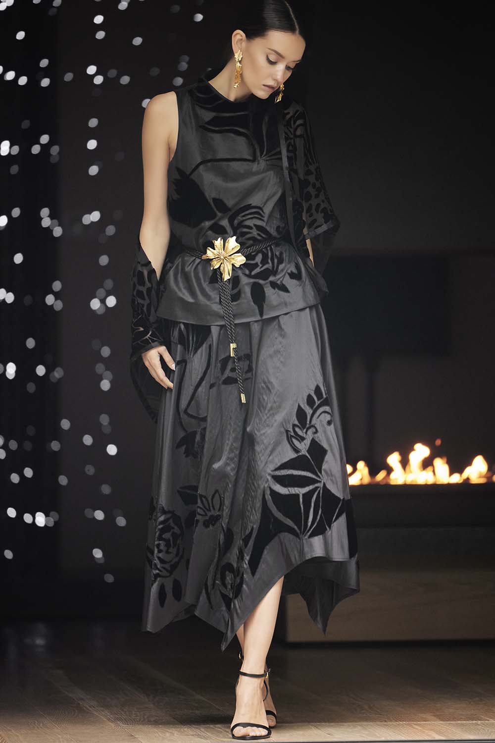 Now, let’s talk about the collection itself. The Fall 2025 collection is a true masterclass in juxtaposition and cultural fusion.In a more refined palette from previous collections, this is monochrome drama at its best: earthy taupes and heather grays ground vibrant ruby reds and cool teals. Shibori-inspired Japanese taffeta, a nod to the intricate tie-dye technique that dates back centuries, gives the collection a unique texture that feels both modern and timeless. The rich, fluid fabric is a perfect example of how Natori blends the delicate artistry of Japan with a sleek, sophisticated edge. Add in sculptural details and 3D embellishments that pop like kintsugi (the Japanese art of repairing pottery with gold), where imperfection becomes the highlight, and you’ve got a collection that redefines luxury.