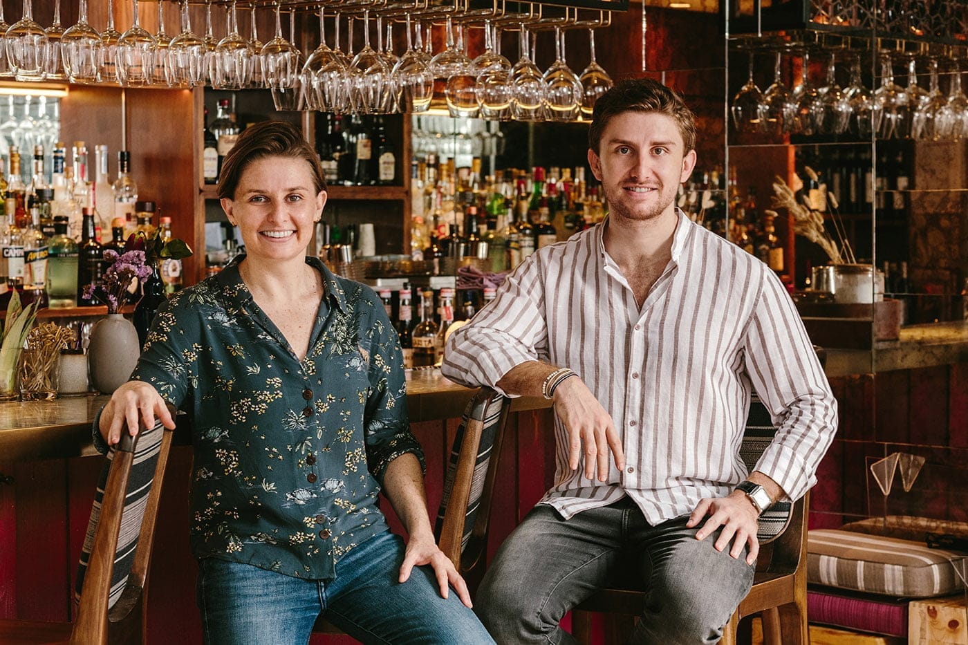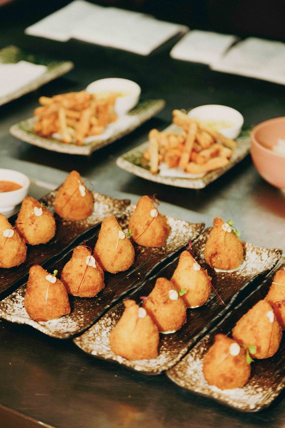 There is much to savor at Uma Nota Manila, and the experience begins with the restaurant’s carefully put-together ambiance. The atmospheric entry hallway of wooden beams that converge into a narrow yet gracefully arched ceiling is reminiscent of Japan’s traditional inns or ryokans. Dramatic lighting and electric lanterns complement the deep brown hues. The stately, moody hallway gives way to a much livelier scene, indoors. Uma Nota Manila calls to mind an old-school Brazilian jazz or Carnaval-style club, with its floor-to-ceiling drapery treatment, ambient lights and pops of color, graceful archways, gilded art-deco accents, and eye-catching eclectic pieces. The ambient feel is lived-in, by design; a vivid vintage vibe that hearkens to Brazil’s popular dance clubs of the 1970s. “The real guideline that we gave our designer, Asmaa Said of Dubai-based The Odd Duck design firm, is that the place needs to feel like it has been open for 15 years. It really has a very vintage-y Brazilian vibe,” Offe shares.